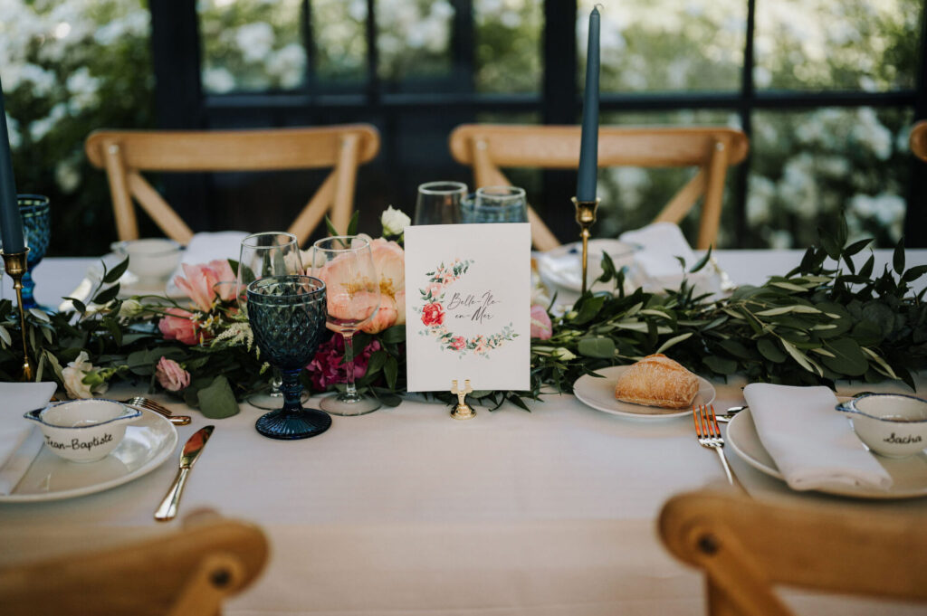 La réception poursuit cette ligne esthétique avec un plan de table sur panneaux bois fleuri. Les tables associent nappages blancs, verrerie bleue, bougies et centres de table bas et colorés, tandis que la table d’honneur se distingue par une guirlande végétale fleurie et des cierges hauts. Les détails personnalisés — comme les mini bols bretons en cadeau d’invités — ancrent la décoration dans une identité régionale chérie.