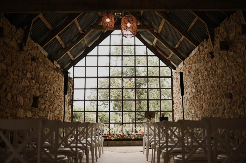 La cérémonie laïque se déroule dans la grange et sa verrière monumentale. Une pièce florale contemporaine est disposée le long de la verrière. Les chaises blanches dos croisé appartiennent au domaine. Le cocktail a lieu entre la cour et le jardin. Il mêle mobilier du domaine et mobilier loué. La décoration repose sur des fleurs colorées, des soliflores, des fruits frais et des fontaines à jus. Des plaids sont proposés en option pour le confort des invités.