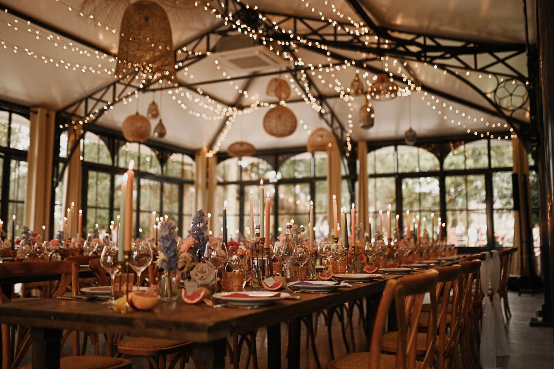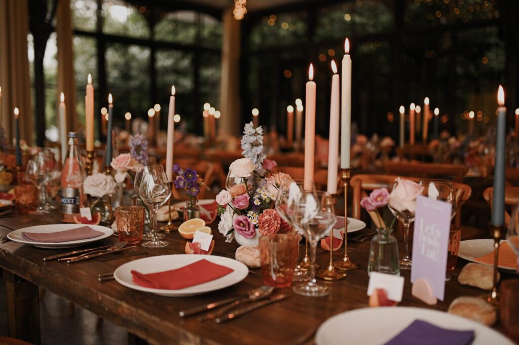 Le dîner réunit 130 convives autour de tables rectangulaires en bois et de chaises dos croisés. La décoration de table est très colorée : serviettes réalisées par la famille, fleurs réparties en bouquets et soliflores, fruits utilisés comme éléments décoratifs et marque places, bougeoirs dorés avec cierges de plusieurs couleurs. Des verres à eau orange complètent cette gamme chromatique estivale.