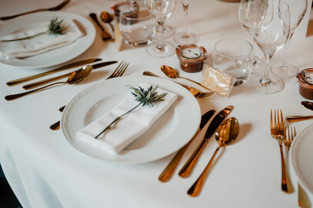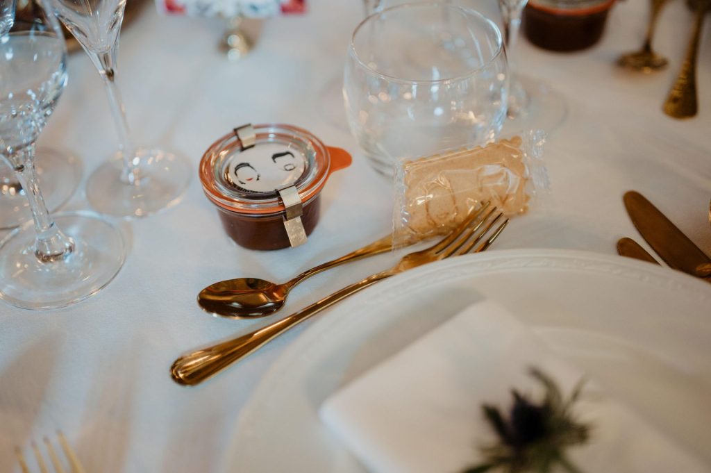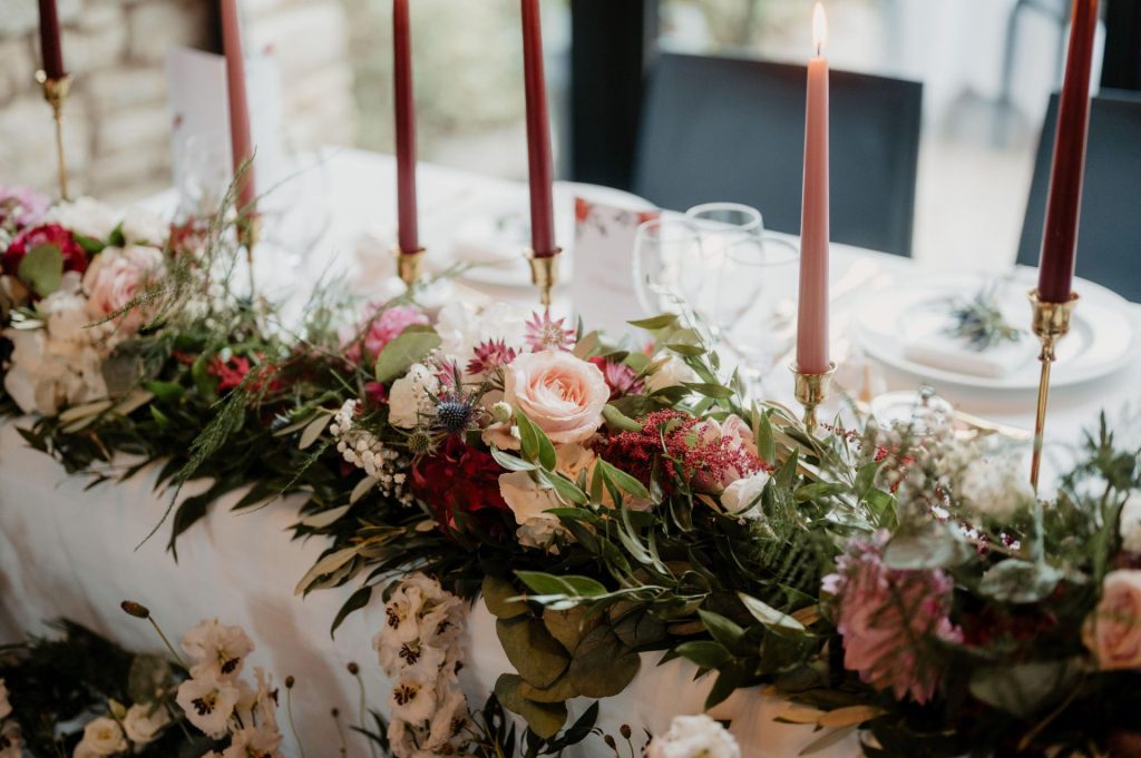 Le dîner se déroule dans une atmosphère chaleureuse et raffinée, rythmée par des tables rondes fleuries, des bougeoirs dorés aux lueurs colorées et un spectaculaire mur de bougies qui enveloppe la salle de douceur. La table des mariés « à l’italienne », placée face à l’entrée, devient le cœur lumineux de la réception. À la nuit tombée, la fête se prolonge à l’extérieur sous les lanternes et bougies, autour d’un cigar et chocolate bar, dans une ambiance festive, conviviale et résolument élégante.