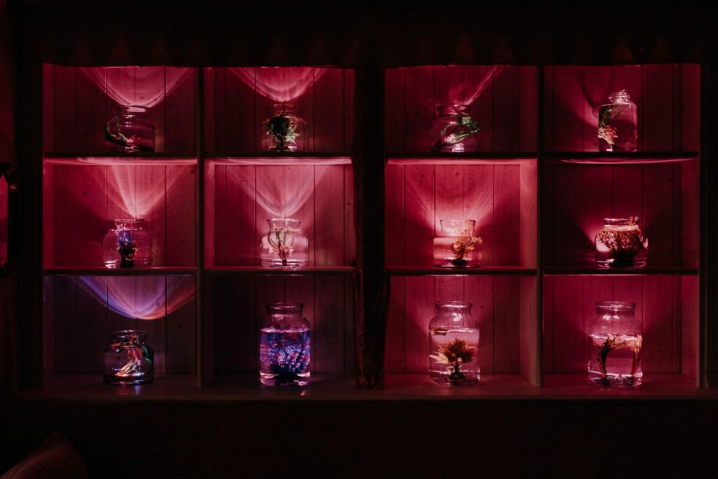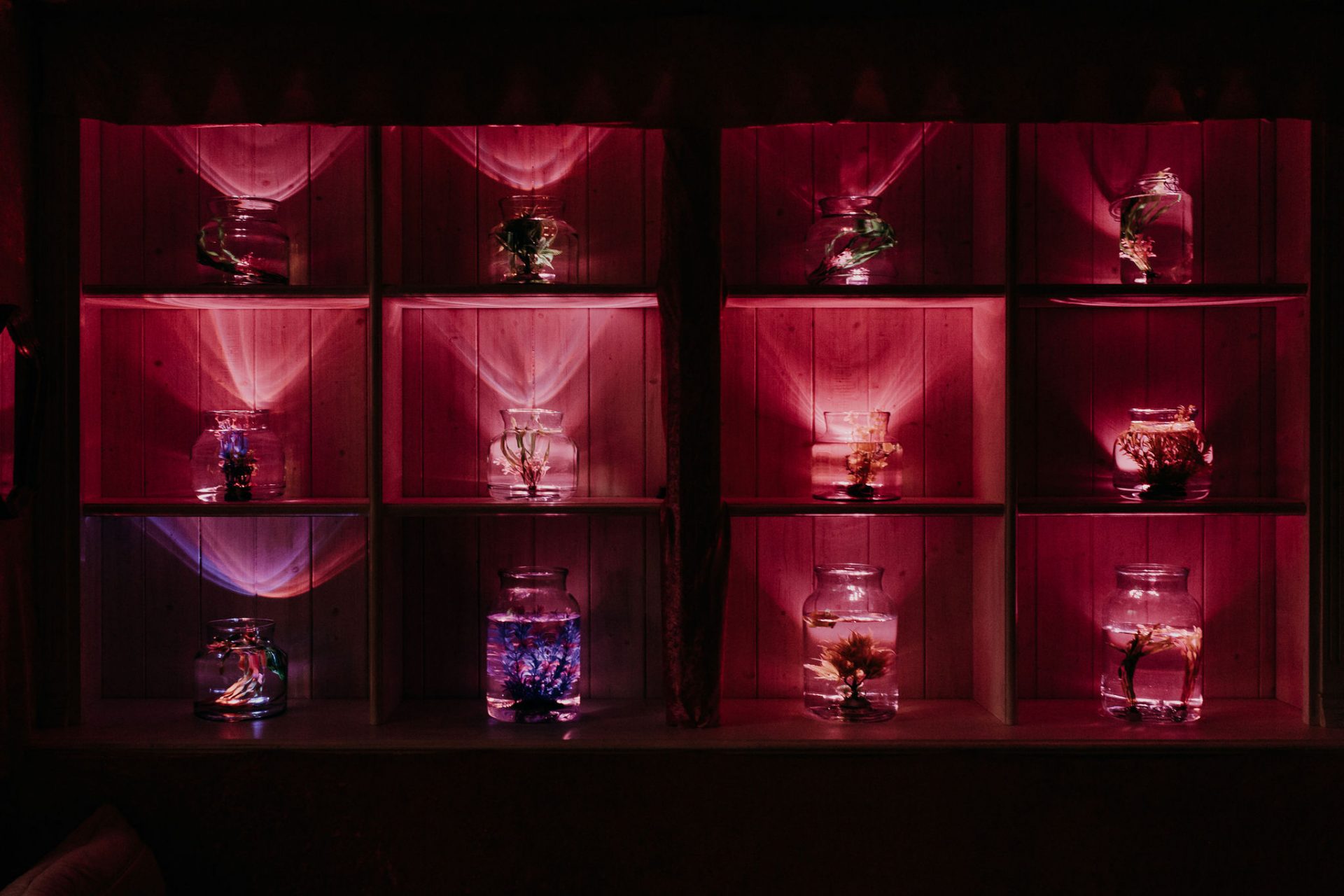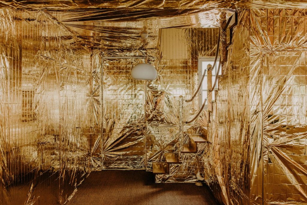 À la nuit tombée, la maison devient une œuvre à part entière. Entièrement recouverte de couvertures de survie, elle se pare d’un or éclatant, transformant les volumes en un décor immersif et radical. Une pink room prend vie ponctuée d’aquariums illuminés, diffusant une atmosphère psychédélique et sensorielle. Les espaces se métamorphosent en installations artistiques, brouillant les frontières entre fête et expérience.