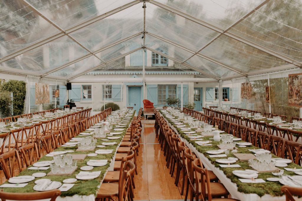 Le dîner se déroule sous un chapiteau cristal de 200 m².L’espace est structuré par de longues tablées en bois et des canevas muraux dans un esprit « Fête Galante ». La décoration des tables est faîte de mousse de forêt stabilisée, vaisselle vintage et lampes à huile dépareillées.