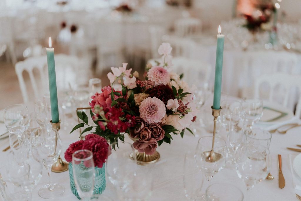La décoration de la salle comprend un plan de table sur miroir doré, décoré de fleurs, le fleurissement des 10 lustres de la salle, un espace dédié au livre d’or. La décoration de table est composée de bouquets généreux et colorés, de vases bleus, bougeoirs et couverts dorés, d’une carterie personnalisée réalisée aux Etats Unis.
